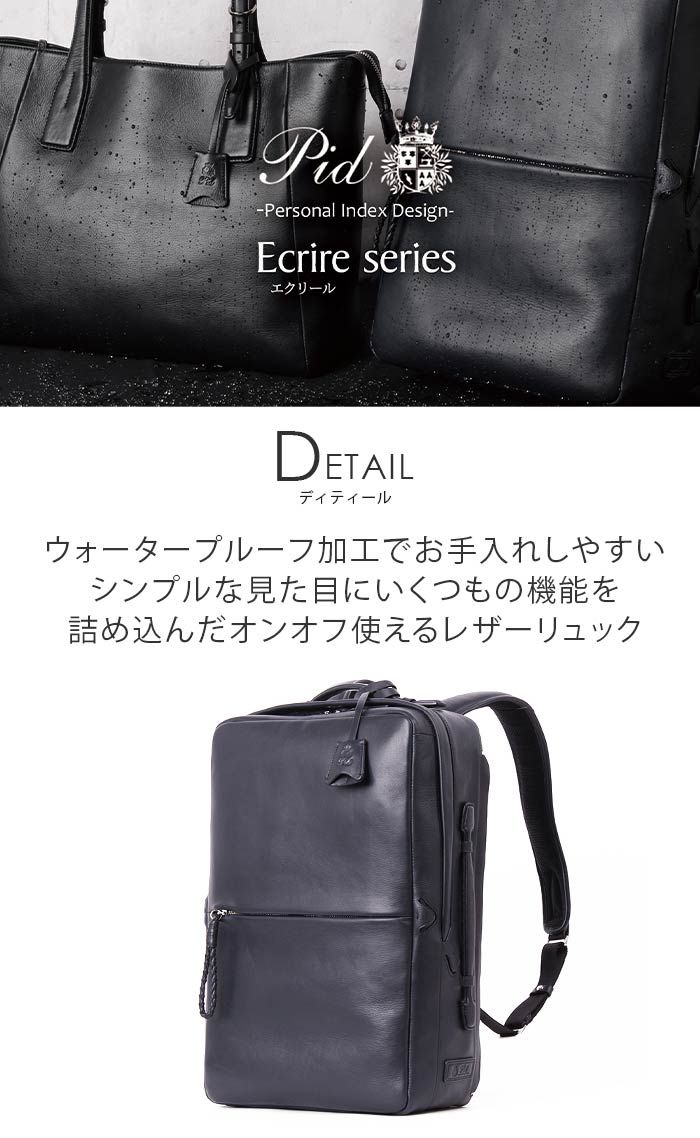 商品名P.I.D PID エクリールシリーズ ウォータープルーフレザー 通勤用リュック 通勤用バッグ スクエアリュック スクエア型 A4サイズ A4対応 25リットル 機能的 PC タブレット ノートパソコン iPad ハンドル セットアップ機能 シンプル 無地 黒リュック 黒バッグ スリム 縦型 ユニセックス メンズ用 男性用 レディース用 女性用 大人 社会人 就職 就職祝い プレゼント ギフト お祝い 会社 撥水 ビジネス用 都会 都会的 デイリー 通学 大学生 スクール 旅行 20代 30代 40代 人気の おしゃれ 紳士 パパ 父 父の日 スタイリッシュ カッコイイ ポケット キャリーオン 丈夫な チェストベルト ネイビー チョコ 茶 紺この商品について手触りの良いソフトな仕上がりのスムースレザーに強力な撥水加工を施した新しいアプローチの撥水レザーバッグ『エクリールシリーズ』の登場です。